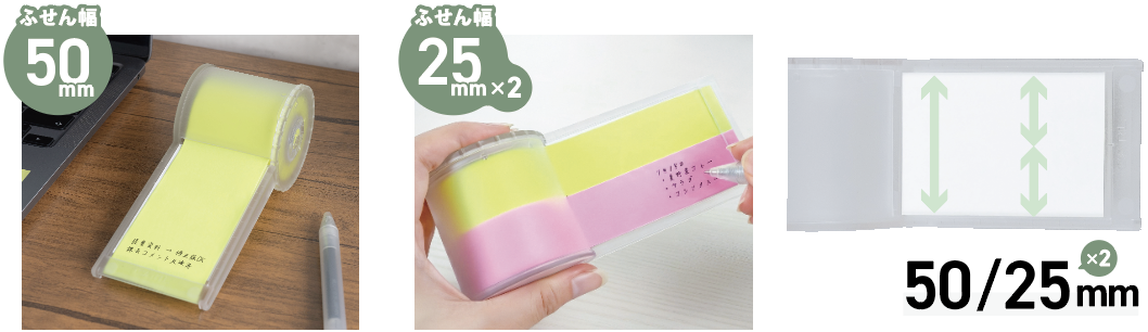 50mm幅ふせんを1巻、または25mm幅を2巻取り付けることができます。より幅の狭い付箋を使用する場合、ロール付箋ホルダーに張り付かない場合がございます。