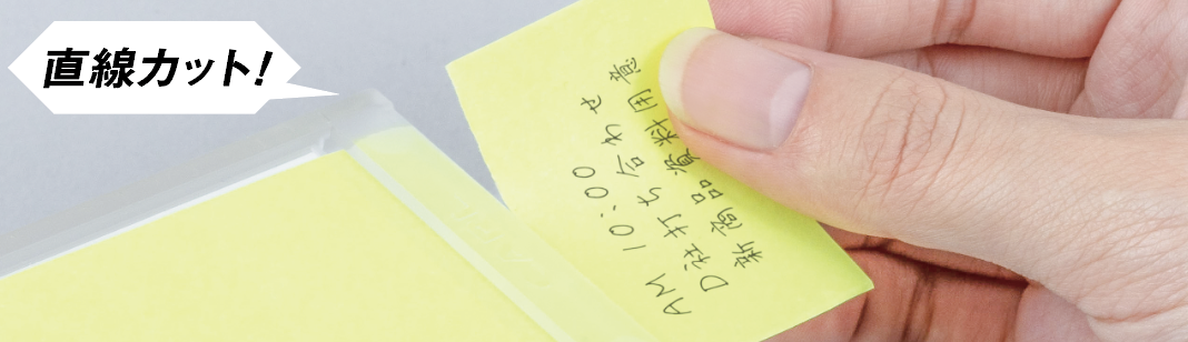 台座にカッターが付いているテープディスペンサー形式なので、各場所もハサミも不要。ふせんを片手でかんたんに美しくカットできます。